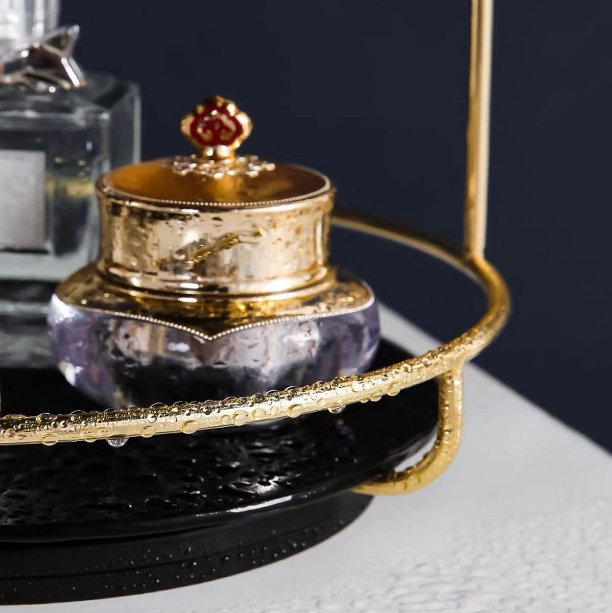 Deze verfijnde make-up / parfum organizer bestaat uit 2 lagen met messing frame. Het unieke aan deze organizer is dat deze voorzien is van een 3600 draaiplateau, waardoor je al je mooie producten in een handomdraai kunt pakken. De glasplaatjes zijn van zwart rookglas.